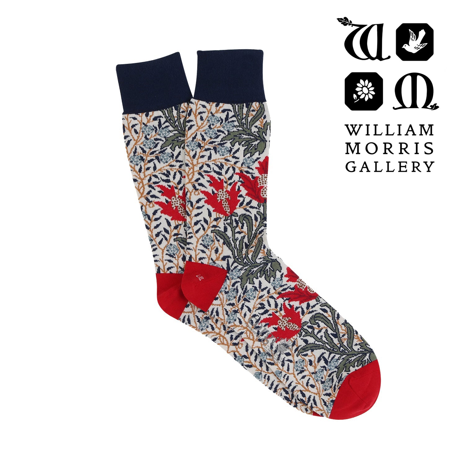'Borne' designed in 1905 by John Henry Dearle, William Morris apprentice. Originally a block printed textile, the printed socks feature striking red flowers on a delicate backdrop of foliage and twine.