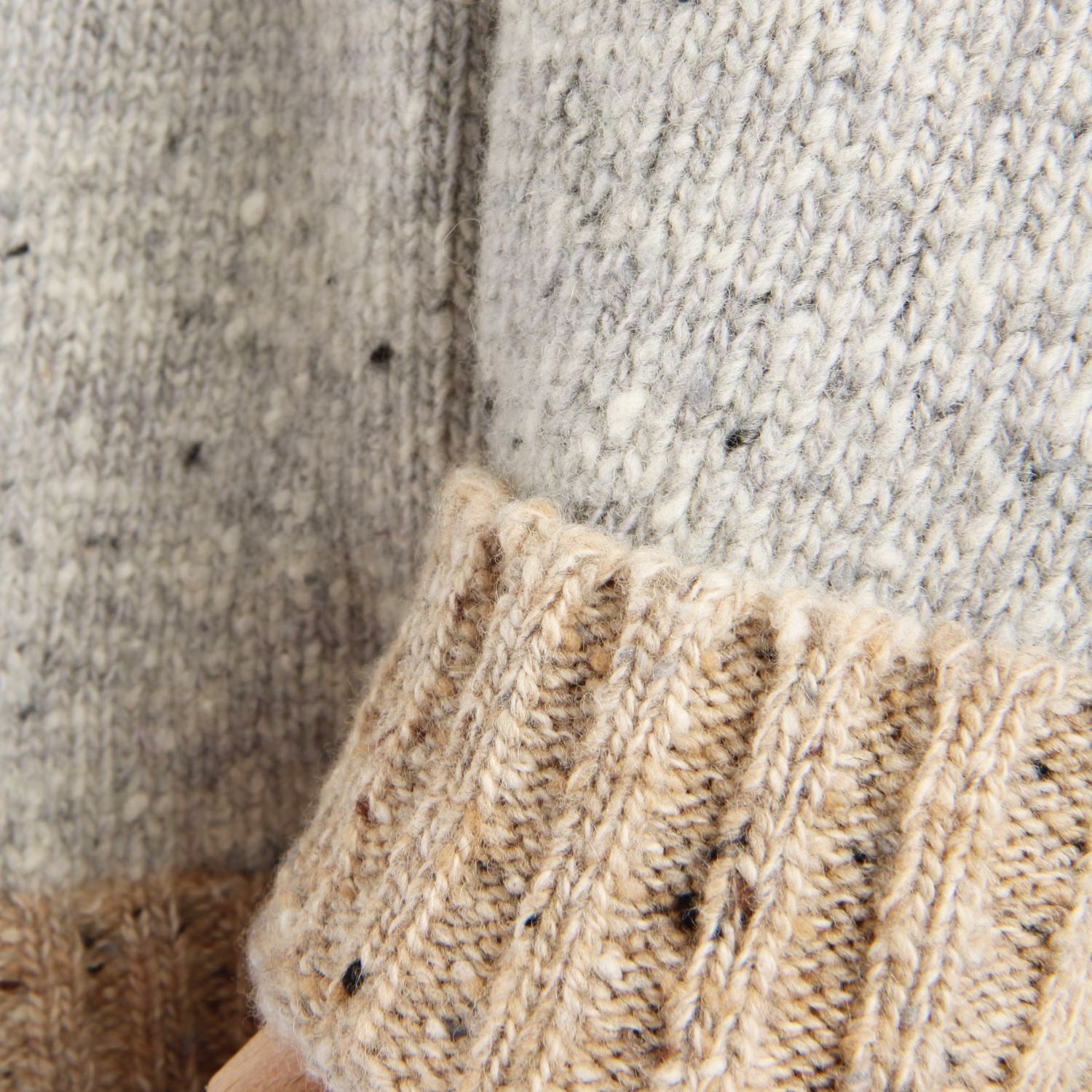 Genuine Donegal wool is carefully crafted and spun in Ireland, renowned for its rich, rustic texture and timeless appeal. The distinctive tweed effect yarns, a signature of Donegal wool, are enhanced with a blend of 10% Cashmere and 10% Silk, creating a unique combination of natural warmth, softness, and subtle luxury. This thoughtful mix offers a level of refinement that elevates the traditional wool, making it an ideal choice for both luxurious knitwear and socks. The result is a beautifully crafted, durable fabric that provides exceptional comfort, warmth, and elegance—perfect for year-round wear. Refer to our How to Care for Knitwear Guide for more information.