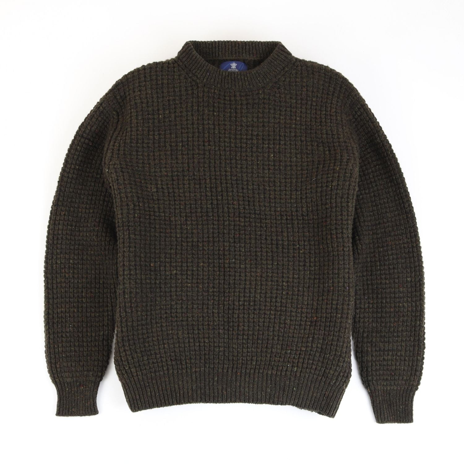 This rustic tweed sweater features a textured 'waffle stitch' is in finished with ribbed cuffs, and hem in a 1x1 rib. With a modern fit in a classic style, the 5-gauge Donegal wool fabric offers a mid-weight feel, perfect for layering during transitional seasons.