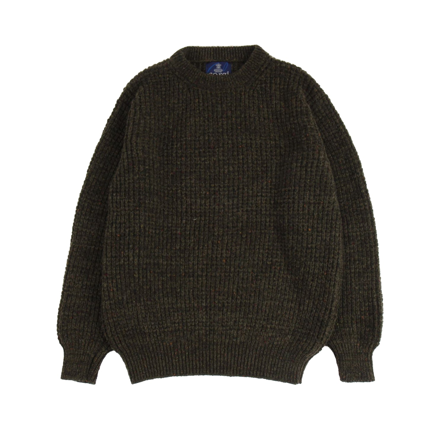 Expertly knitted in Wales, this piece blends timeless craftsmanship with natural warmth and durability. The classic crew neck and structured waffle stitch create a versatile silhouette that’s as at home outdoors as it is in the city. Each garment is unique — a testament to the natural irregularity and beauty of Donegal wool.