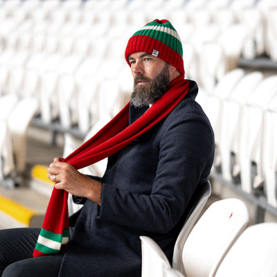 Red and white striped scarf with a logo on a white background Person wearing a black beanie and red and white scarf at a sports stadium. Red and white striped scarf with a logo on a white background