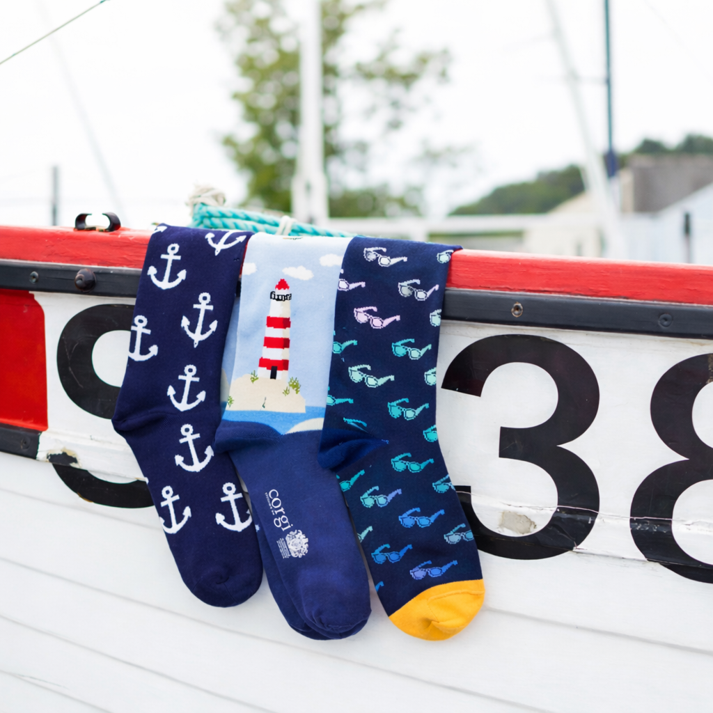 Transport yourself to serene coastal vistas with these men's lighthouse cotton socks. Crafted at our Welsh factory, they feature an exquisitely detailed maritime scene—complete with a steadfast lighthouse and summer skies—rendered in calming harbour blues. Perfect for those who seek understated elegance, these lightweight socks merge artistic sophistication with everyday comfort. Whether navigating your daily routine or settling in at home, they offer a refined touch that speaks to your appreciation for thoughtful design and coastal aesthetics.