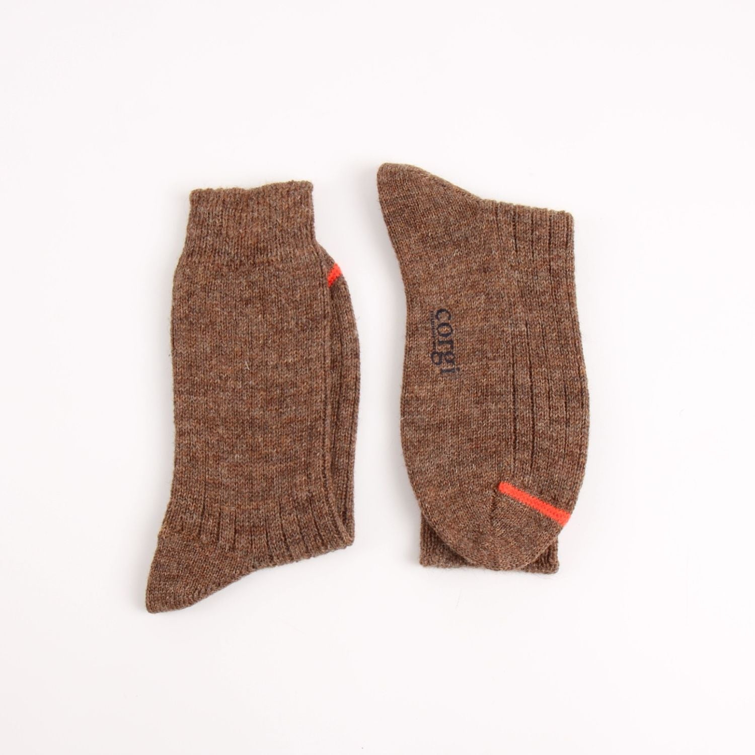 Their chunky knit construction offers a rugged yet comfortable fit, while the subtle flecked texture and earthy brown tone add timeless style. A flash of orange on the toe gives a designer edge. Designed with sustainability in mind, these socks celebrate traditional craftsmanship while reducing environmental impact.
